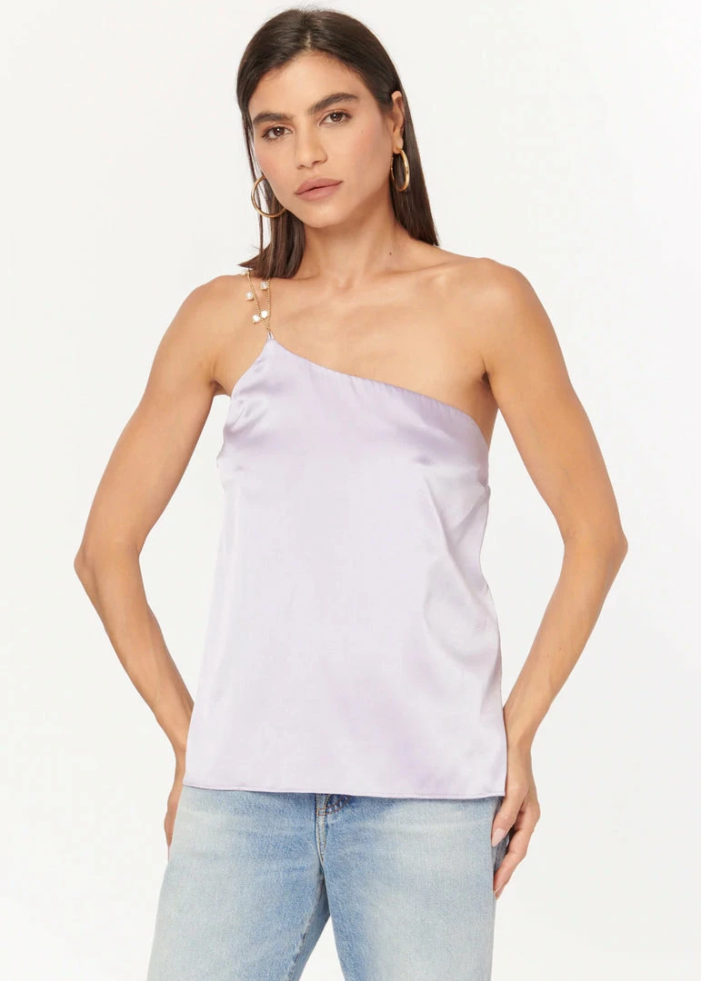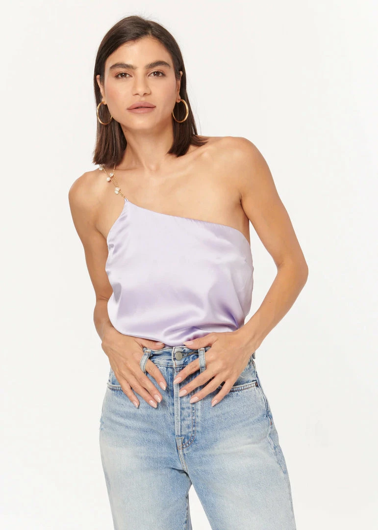 An update to our customer favorite Busy Cami, we are excited to introduce our new Tilda Cami designed with modern and graphic lines and an added feminine touch. Crafted in a silk stretch sandwash charmeuse, the Tilda is a one-shoulder camisole silhouette featuring double straps adorned with baroque pearls. Now available in Orchid, a soft and versatile pastel purple hue.
