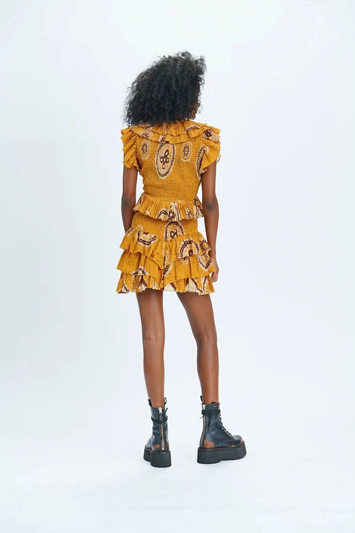Jazz up an outfit with the Maxine Top.  It features a v neck with ruffles, button front, and ruffled sleeves and hem. The back features allover smocking for a flawless fit. Pairs perfectly the Lucille Midi Skirt.Â