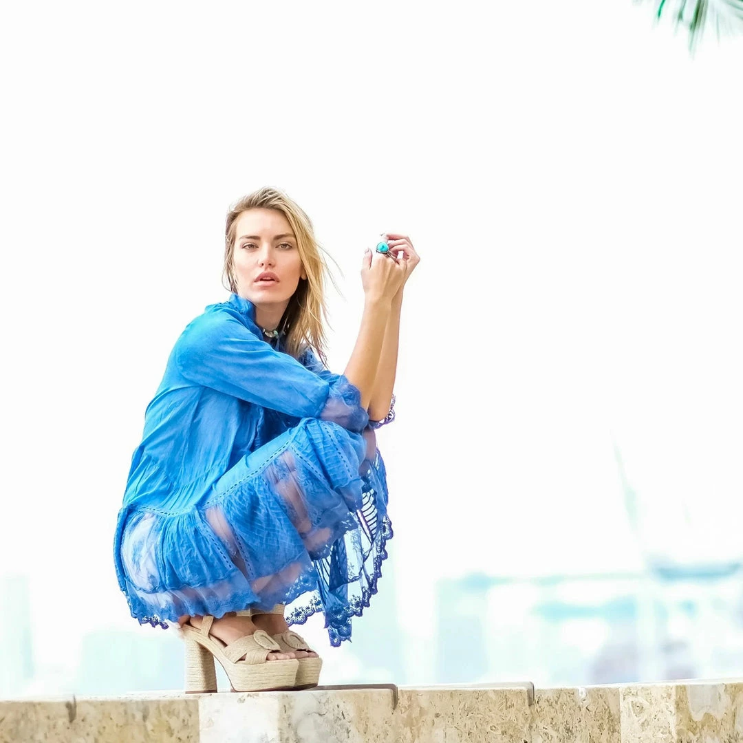 In an easy silhouette this effortless flowy tunic features a couple of button closures down the front. Beautiful flower embroidery detailing allover showing the most charming and classy hippie look!