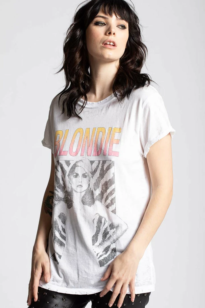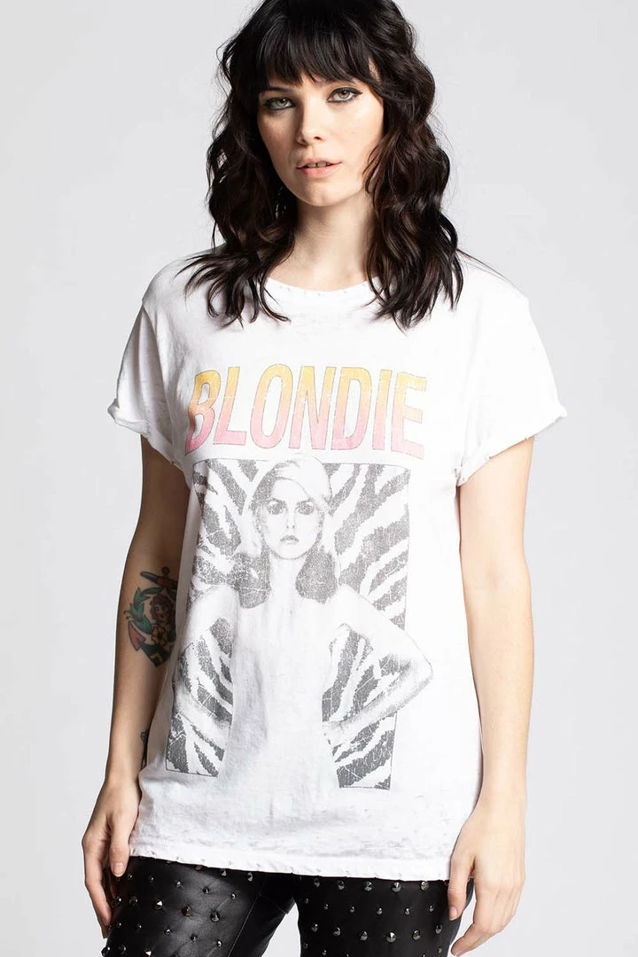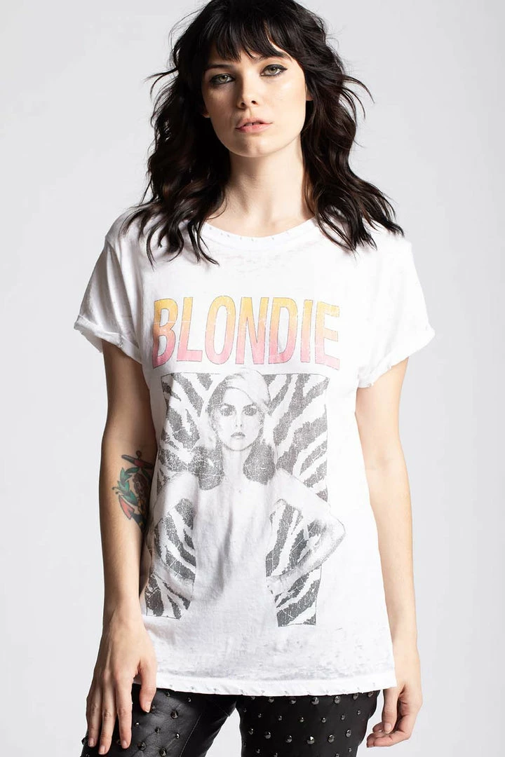 Pay homage to a true icon with this Blondie tee. The retro inspired design features the band’s name in bold type with a blend of pink, orange, and yellow. A photo graphic of Blondie’s front woman and co-founder, Debbie Harry, takes center stage with a zebra print background. Our super soft fitted tee is made with vintage washed fabric, cuffed sleeves, distressed hems, and a ribbed crew neckline.