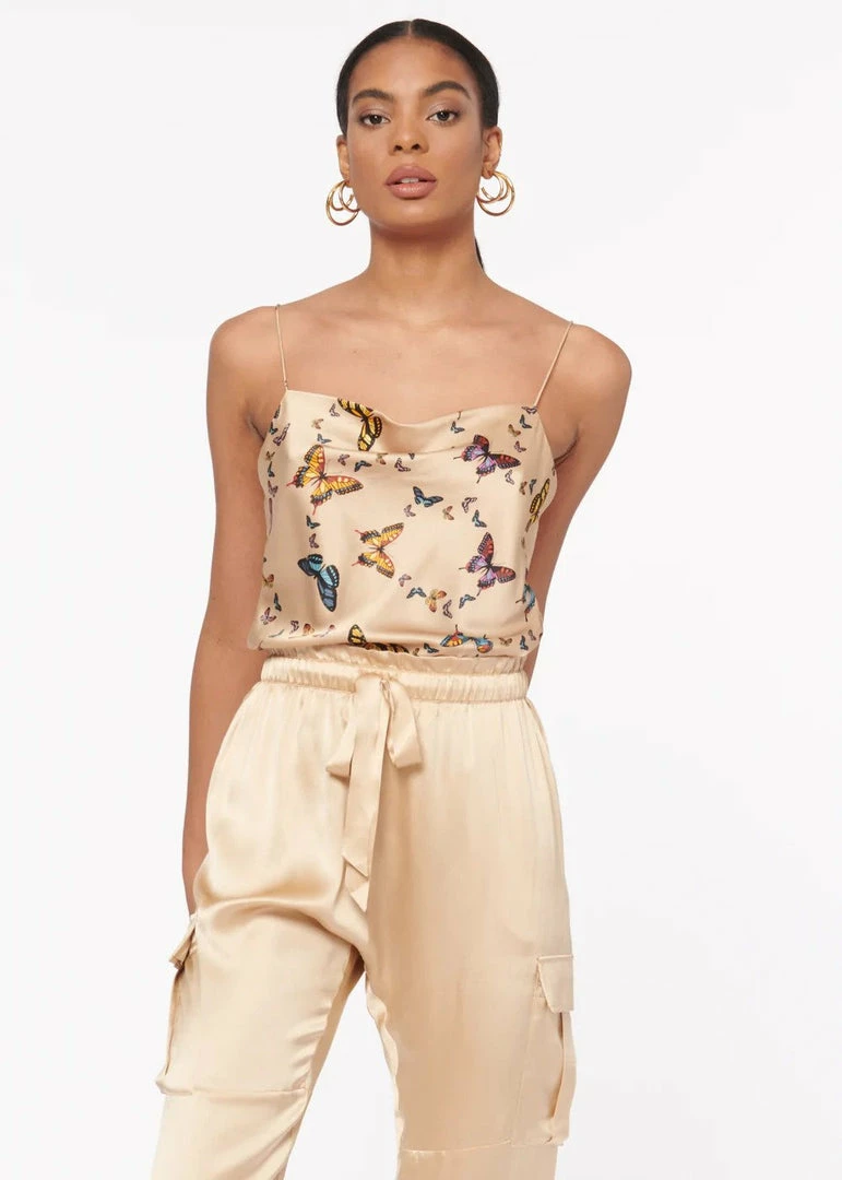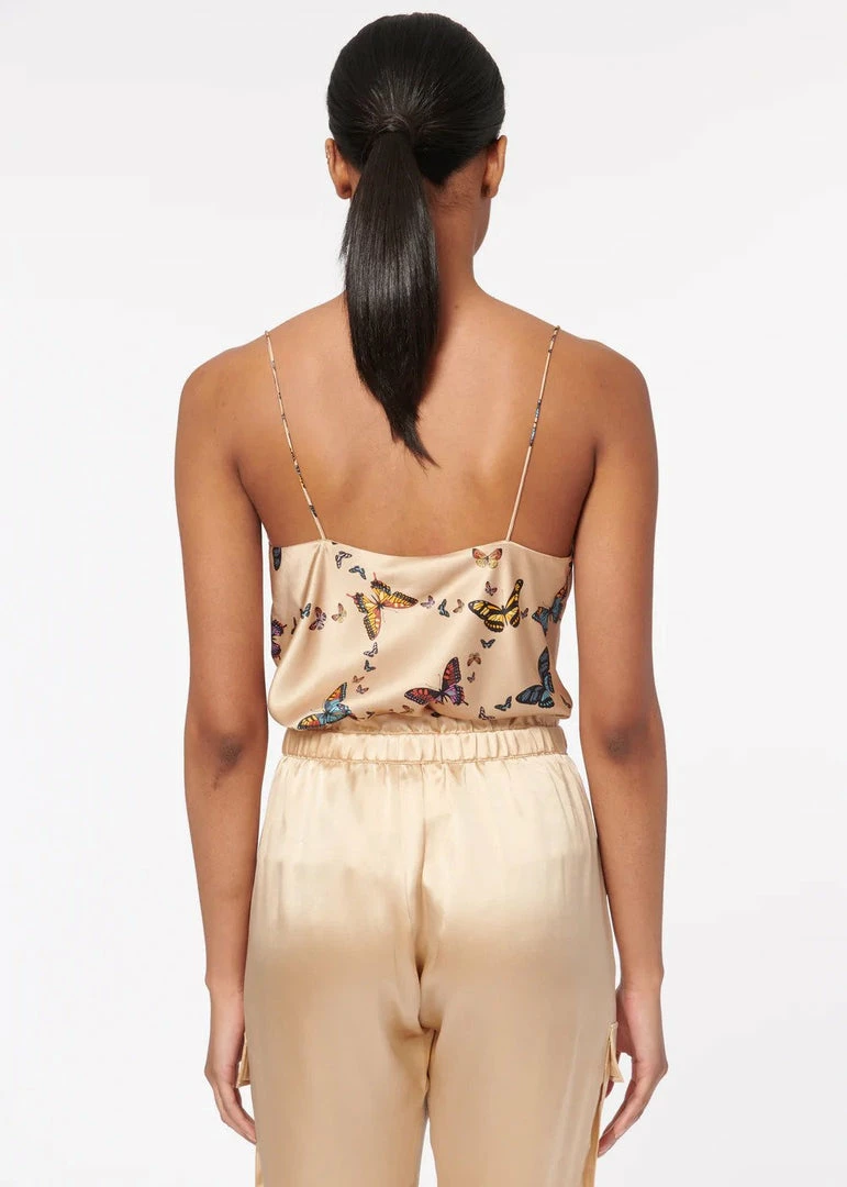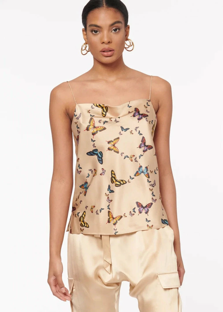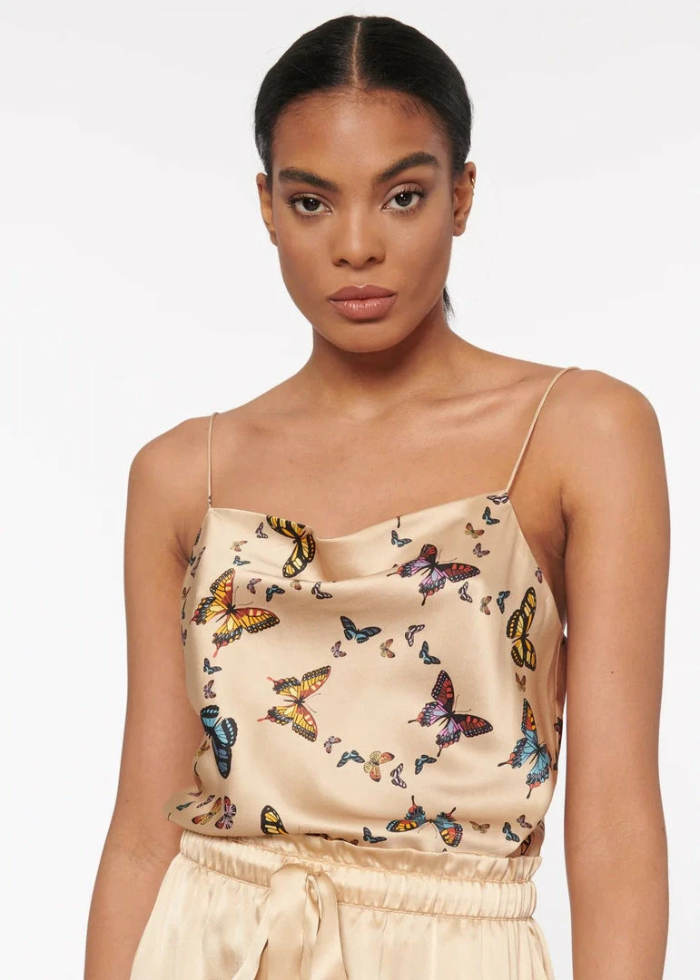 The Axel is a favorite, featuring a bias cut silhouette with delicate straps. The Axel is crafted from a stretch silk sandwash charmeuse featuring a cowl neckline for a sleek and effortless look. This classic silhouette is now available in Butterfly Effect: a bright, multi-scale butterfly print with bright pops of marine blues and sunset yellows on a neutral, golden tan background.
