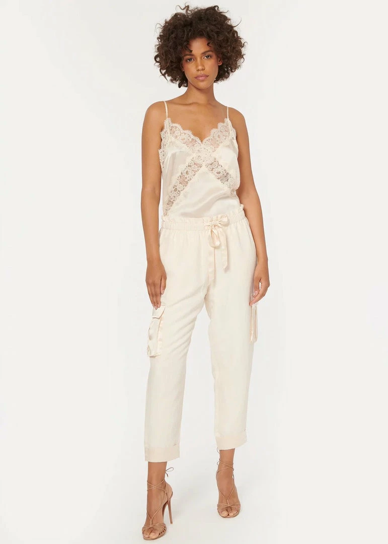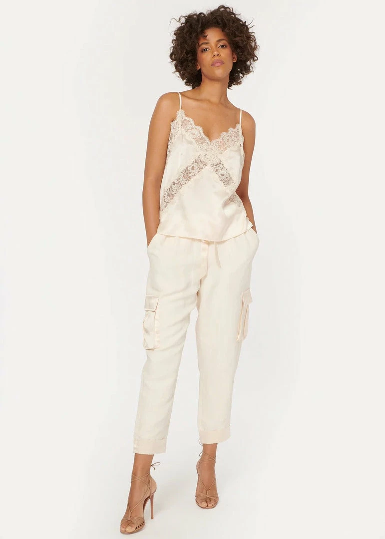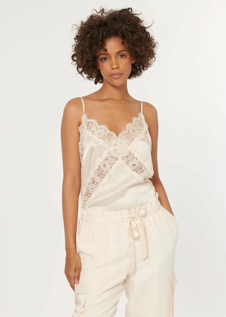 Our CAMI Favorite Dane Cami is crafted in a silk sandwash charmeuse and features a sheer crossover lace detail. Dane is the perfect delicate statement piece, now in Ceramic, a versatile and year-round off-white ivory hue, readily transitioning from day to night. Features adjustable straps for a tailored fit. The Dane is unlined.