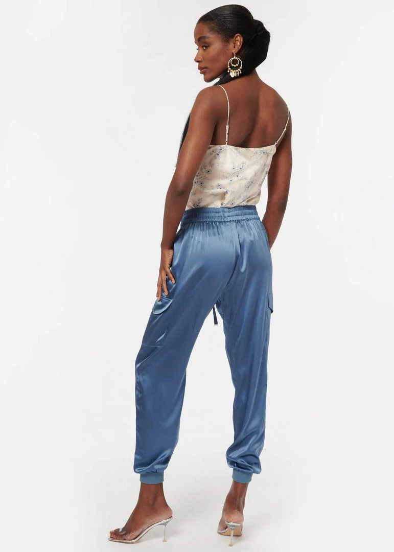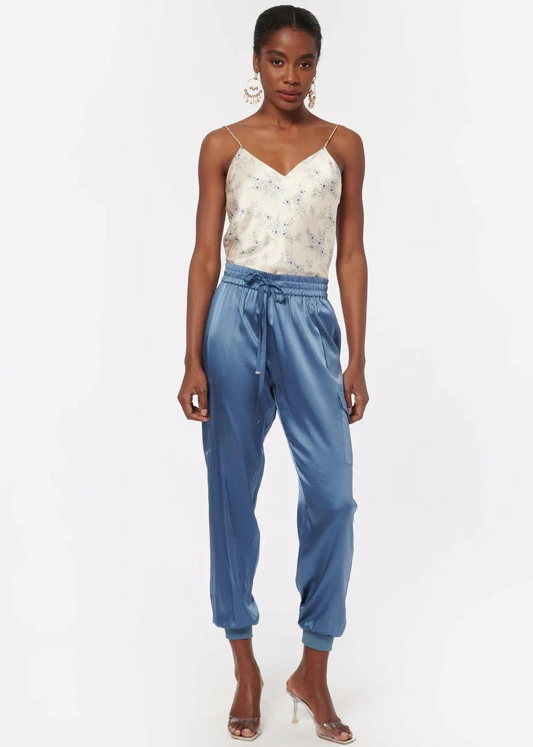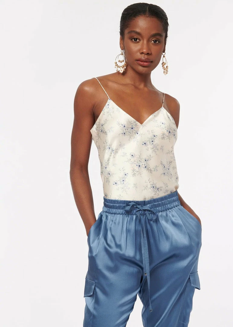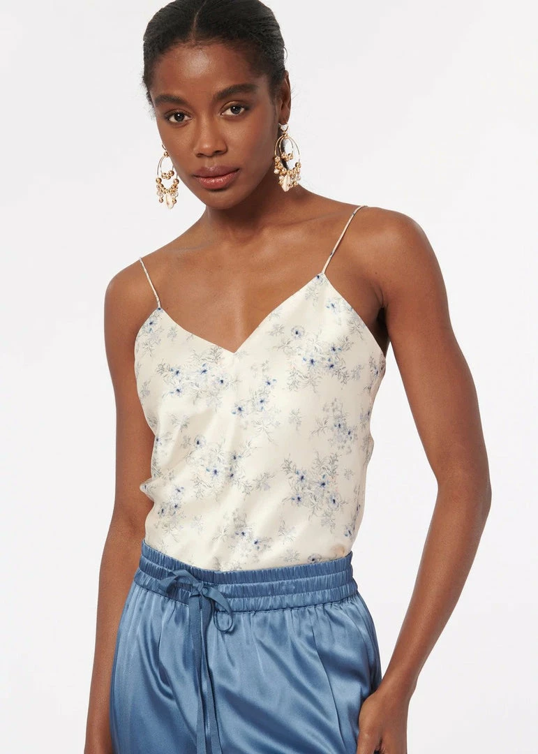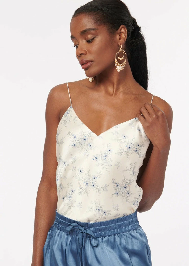 The Raine, crafted from a silk sandwash charmeuse, features a bias-cut silhouette and a V-neckline. This light-weight camisole style is fully lined and features adjustable straps for a tailored fit. Forget-Me-Not is a soft cerulean blue Spring floral atop a solid ivory-based ceramic hue.Â