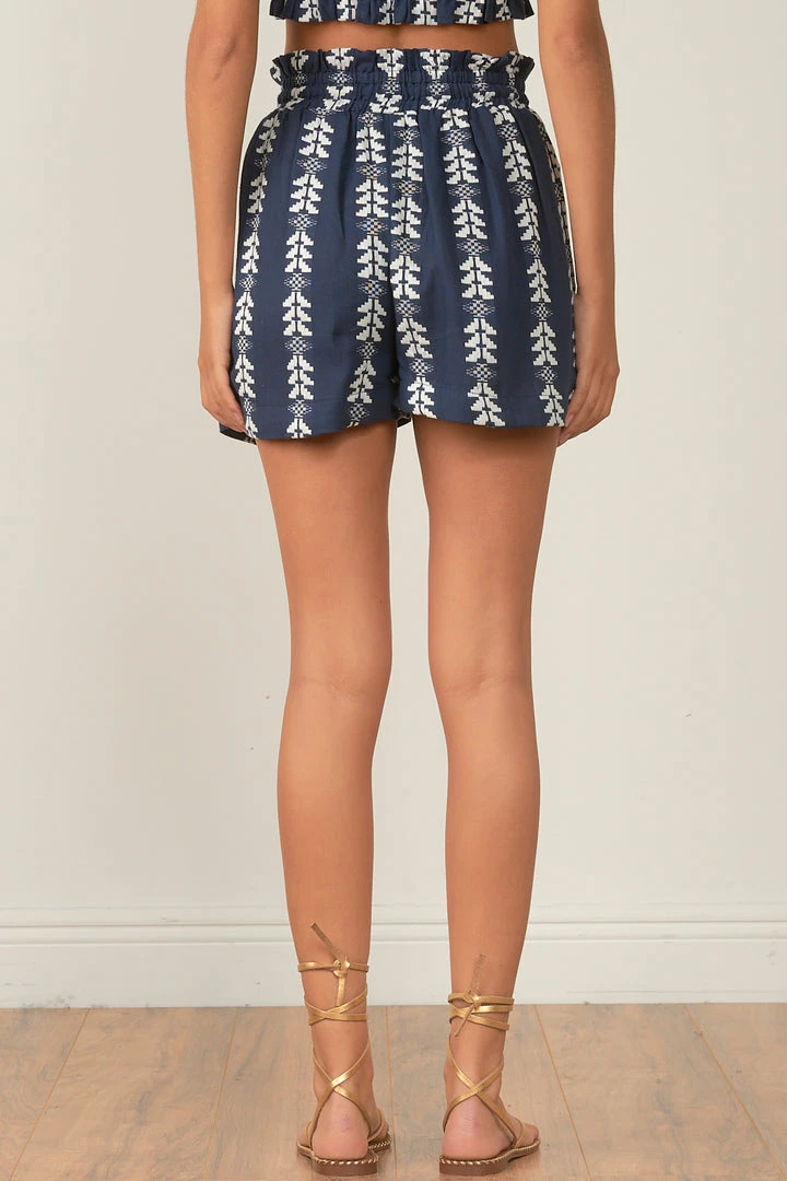 Our Janie short has a high waisted smocked waistband with a pretty tasseled tie. The lightweight cotton is great for any super hot Summer day. Pair with the matching Janie Crop Top, Tank or Tee and Solei Sea Flip Flops in Navy to complete the look.Â