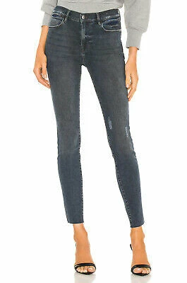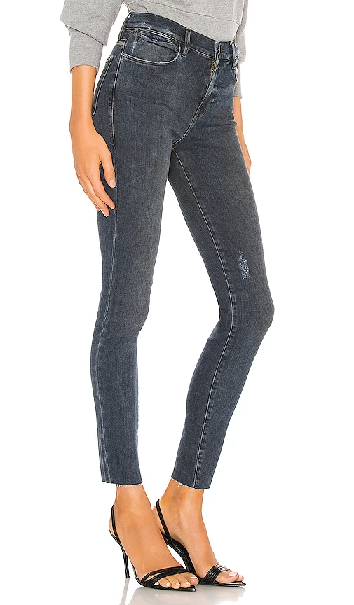 A classic high-rise skinny jean with a modern feel. Designed to sit at the small of the waist with a form-fitting shape, this dark-blue wash features raw hems and slight destruction throughout.