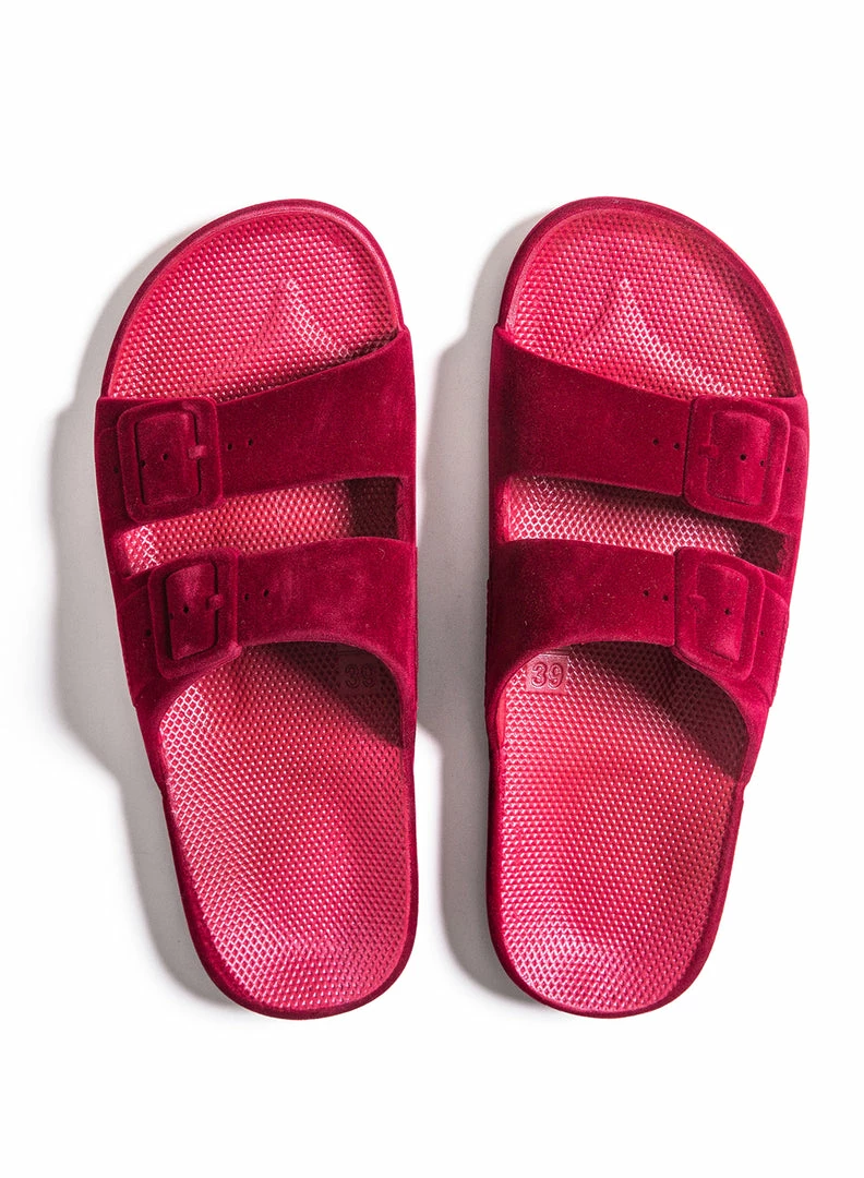 Two strap sandal with non-adjustable buckles. Freedom Moses slides are injected with air for a super comfortable walking experience. Gently infused with essential oils with a milk & honey scent. All our slides are vegan and sustainable. We are also recyclable in the appropriate bins.Â
