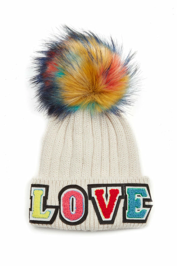 The Be In Love Hat is our knit hat with fox fur rainbow pom. You will LOVE wearing this hat all season longÂ