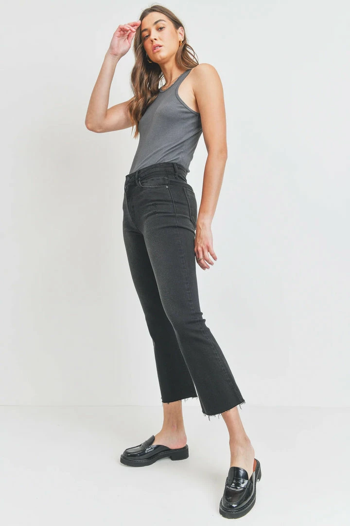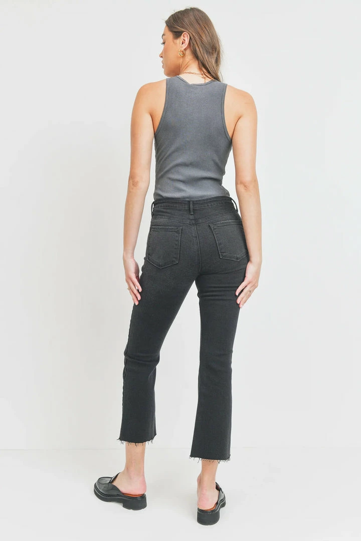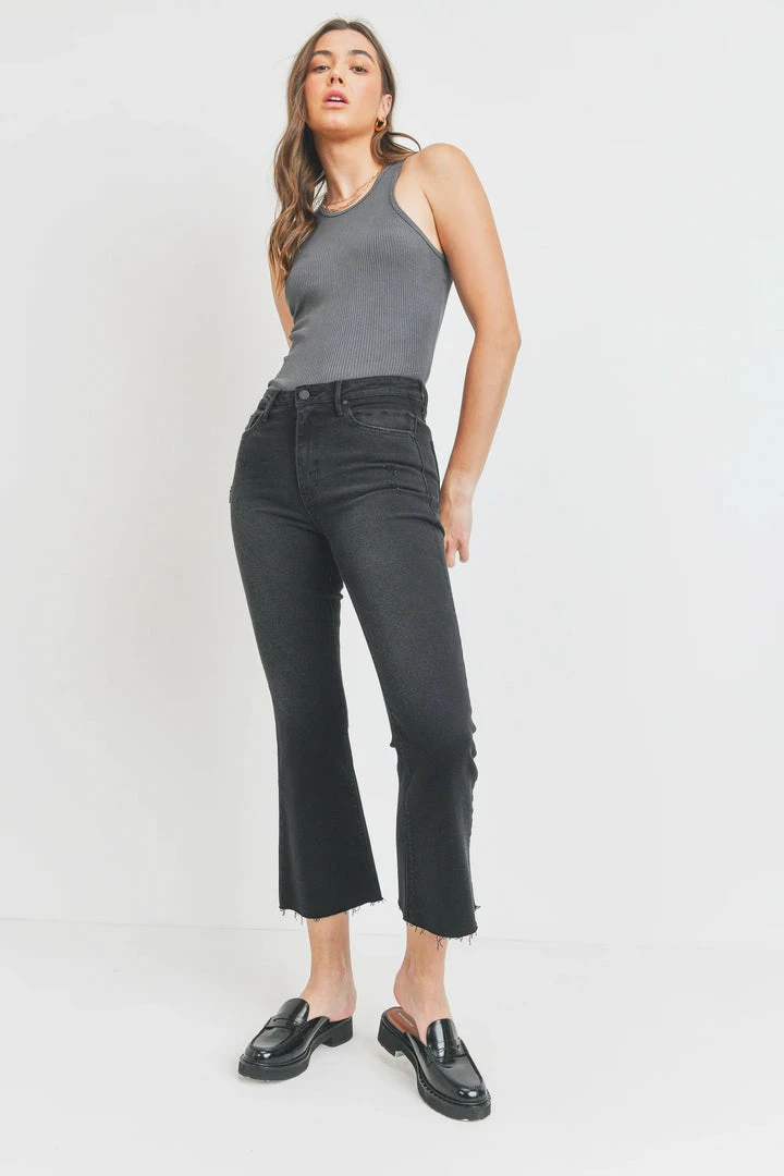 Slim from the hips to thighs with a gently flared leg and perfectly cropped to show off a chic pair of shoes. With just enough stretch for all-day comfort, The Cropped Demi Flare is destined to be a fast-favorite. There is slight destruction by the front pockets and the hem is raw.