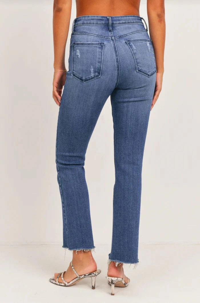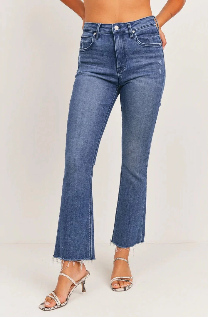 A clean high rise jeans with a cropped flare and distressed hem. This jean sits at the waist and has a clean finish in a light rinse. We’ve also added some stretch for comfort and a better fit.