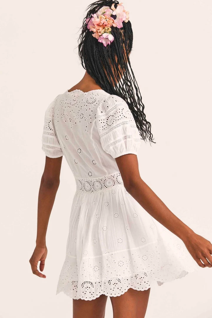 Meet our Valente Dress, a new silky favorite with a mix of eyelet embroidery and inset lace. This frock features puffed sleeves with elastic at opening, a shaped scallop-edged neckline that plunges to an overlap at front and an ornate waistband. The full sweep miniskirt is shirred with a scalloped bottom hem.Â