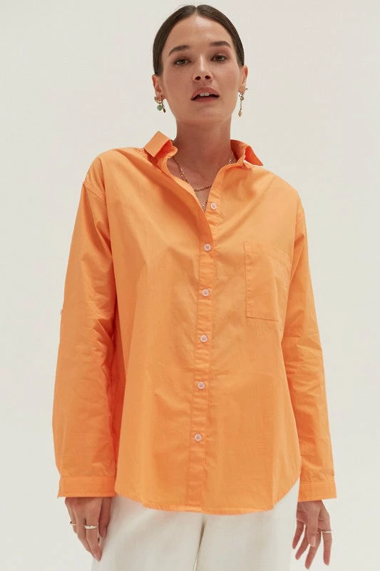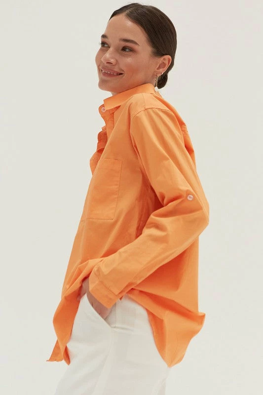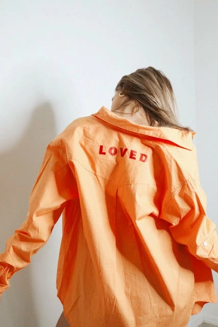 Our LOVED shirt is made of a crisp cotton poplin. Designed in a relaxed shape, it has a button-down collar and two chest patch pockets. Wear yours with jeans, shorts, or a bathing suit! Leave a few buttons undone at the neck for a more laid-back take.