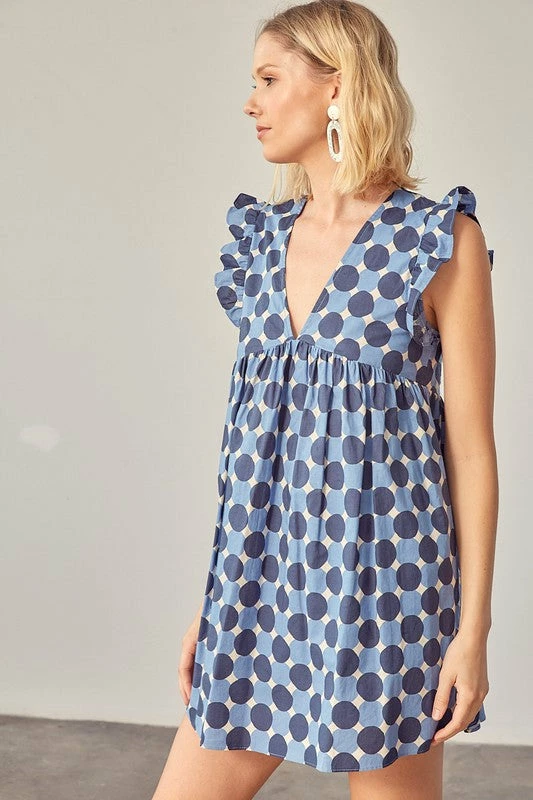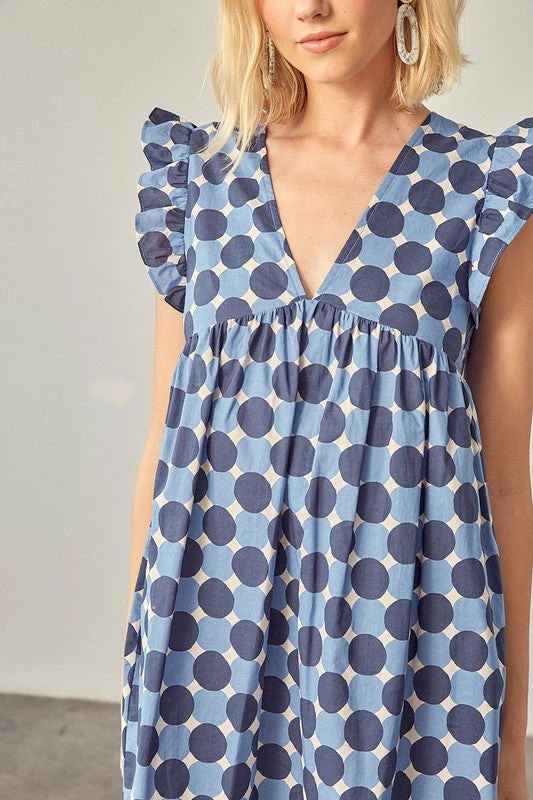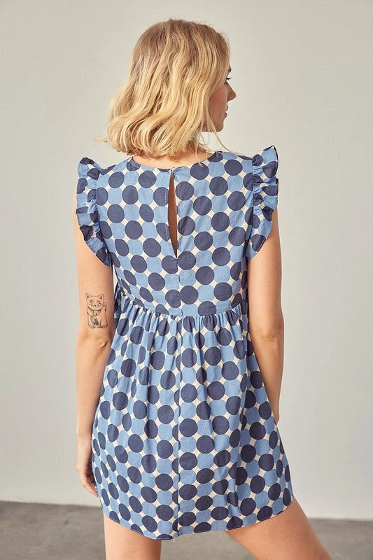 This geo print baby doll dress is actually a romper. It has flutter sleeves and a keyhole closure on the back. Great for a day time party or dress down with a sneaker.