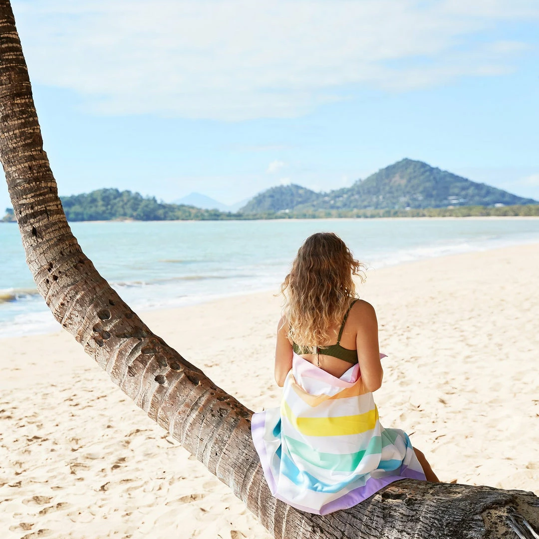 The Summer Collection. Our cabana towel with that summer twist. Quick dry – 3 times faster than a standard cotton towel. Sand free beach towel – shakes right off. Compact & lightweight. Super absorbent. Won’t collect damp smells. Elastic hook – to hang it out to dry. Handy pouch included – to keep your towel & travel accessories in one place. Made from 83% Polyester, 17% Polyamide. Microfiber.Â