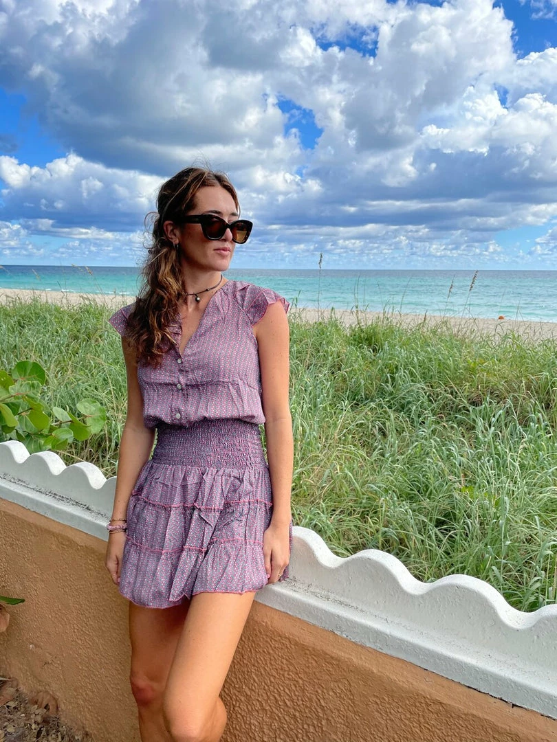 This button up front mini dress from Perry Walker is an Olive and Bette’s Favorite. Its easy, pretty and comfortable. Dress up with a heel or for a more casual look, wear with a sneaker. This style features a tiered mini skirt,  flutter sleeves and ruched waist.Â