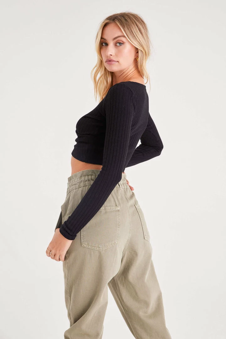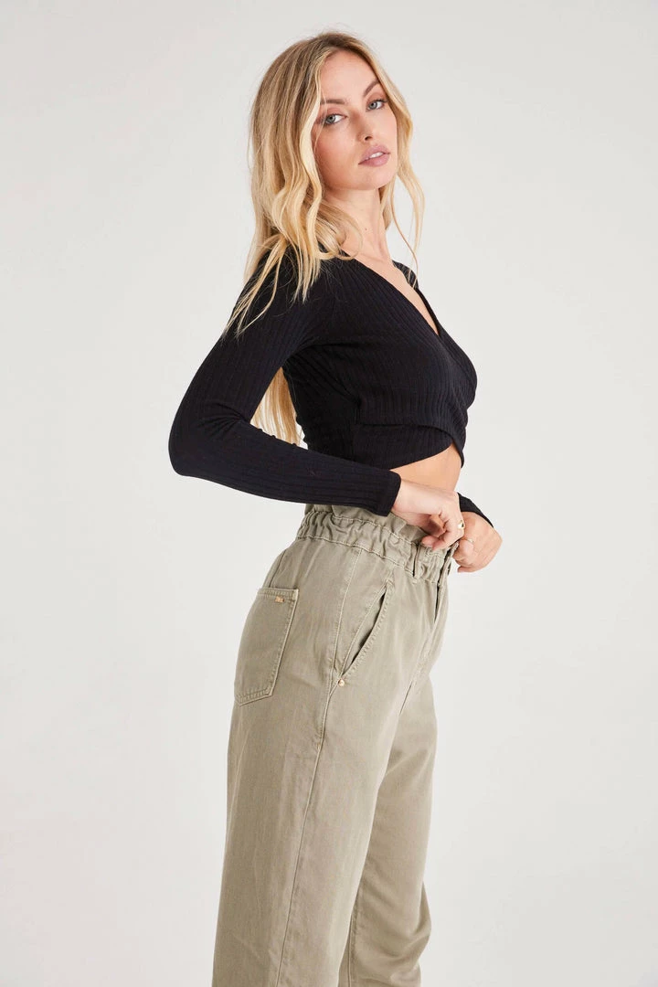 The Simone has a v-neckline and a surplice wrap detail in the front. This fitted top is made with ribbed knit fabric and has a cropped hemline. Style with your favorite denim, leather, or silk. This top goes with anything.Â