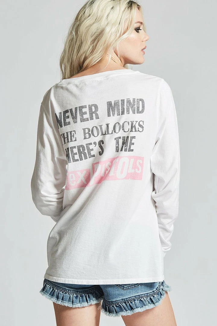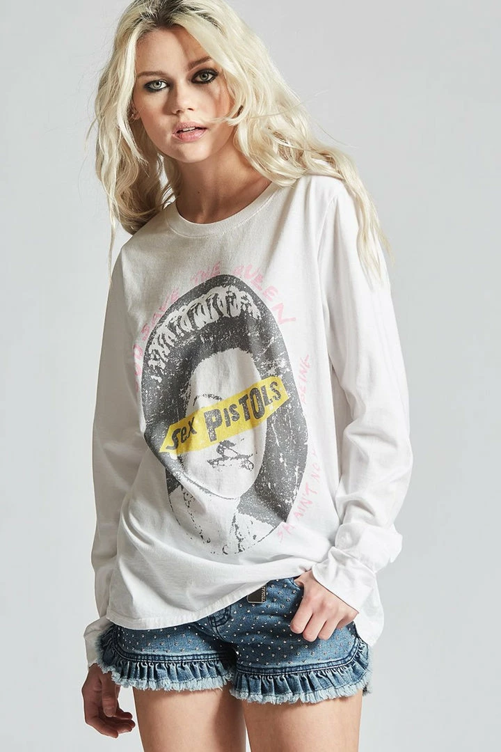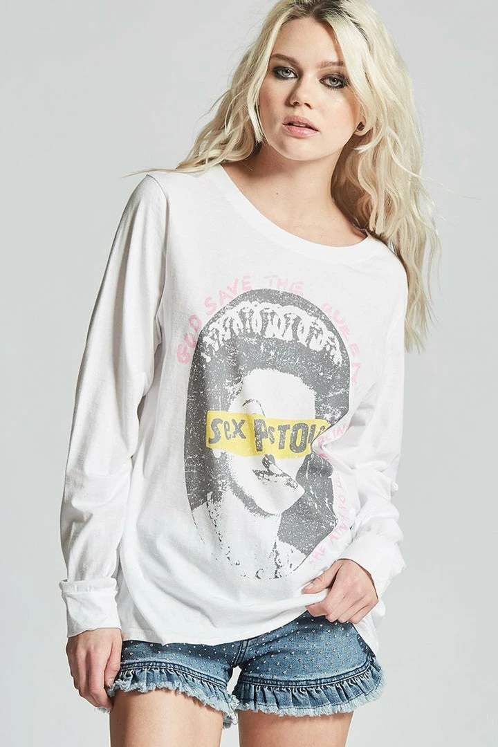 “God Save the Queen” is one of the Sex Pistols’ most iconic songs from their 1977 album, “Never Mind The Bollocks, Here’s The Sex Pistols”. Our unique long sleeve tee features the album’s iconic artwork on the front and back. Made with soft cotton fabric, a crewneck line, and loose comfortable fit.