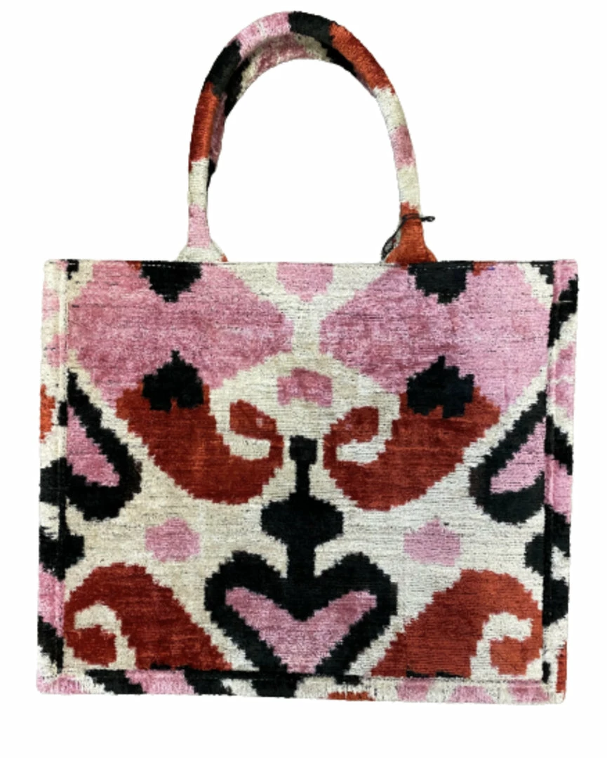 Ikat is a 5,000-year-old tradition. Our silk velvet Ikat bags are completely hand-crafted start to finish. Silk is boiled over an open fire, hand dyed, then hand woven on a small loom all in Uzbekistan. Then each bag is hand sewn by our atelier in Istanbul.